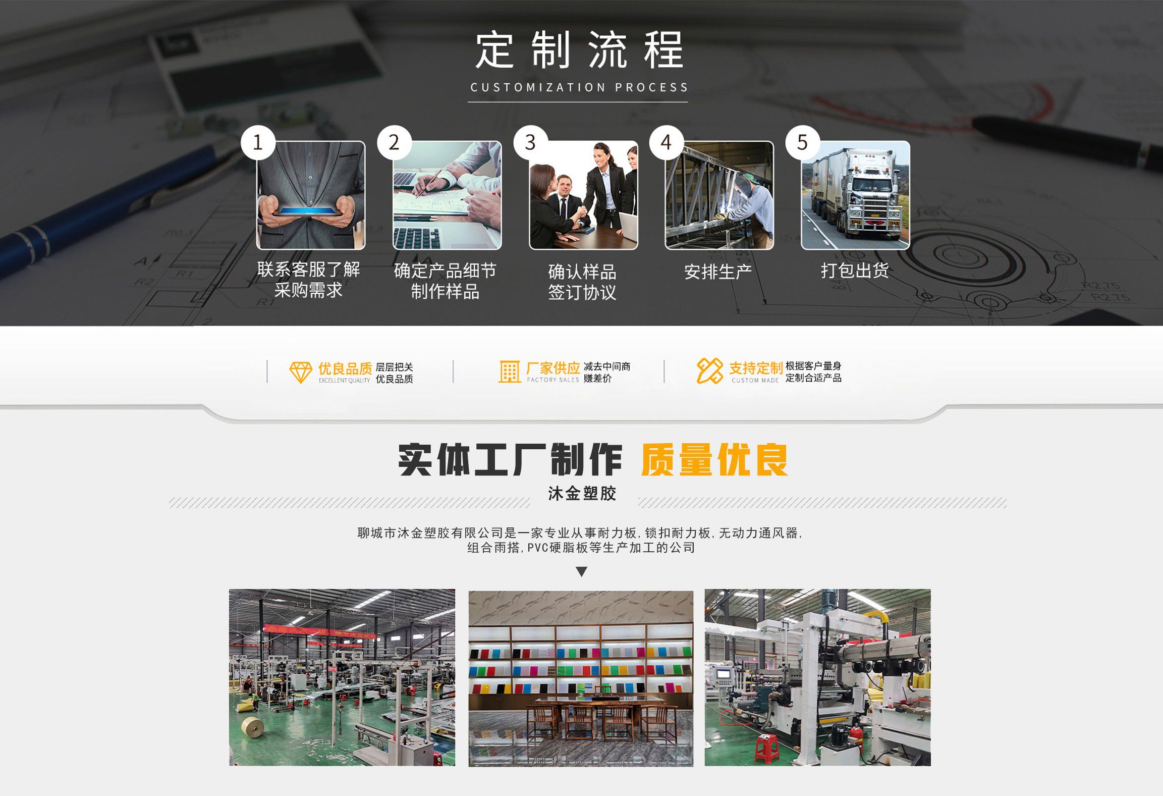 聊城市沐金塑膠有限公司注冊資金2180萬元,占地20000余平方,擁有自建廠房15000平方,員工100余名。10余年來,公司主營耐力板,鎖扣耐力板,耐力板深加工,無動力通風器,組合雨搭,PVC硬脂板,耐力板廠家等板材的發展戰略,逐漸成長為綜合性企業?! 」緭碛卸鄺l板材共擠生產線,采用世界知名品牌進口原材料和先進工藝,依據完善的ISO9001質量管理體系和ISO14001環境管理體系,為產品的卓越品質提供了強有力的保證。憑借過硬的創新能力和堅實的硬件基礎,贏創已成為國內領先的熱塑性板材生產商,產品被廣泛應用于建筑業、農業、工業、廣告業、安防行業及DIY領域。 公司始終致力于通過提供最優的板材應用解決方案,為客戶創造最高的價值;堅守創新、質量、靈活、服務和速度的核心價值觀;堅持“完美的產品需要完美服務的支持”的經營理念,努力實現成為世界領先的板材與解決方案供應商的夢想?! ≡谖磥?,公司將立足客戶需求,不斷改變和完善現有產品,拓展產品線和充分開發板材的應用領域,為客戶創造全方位的價值。同時更好地實現員工的價值,實現公司團隊的價值。我們將與您一起創贏未來! 企業使命:成為世界領先的板材與解決方案供應商。 公司愿景:通過提供最優的板材應用解決方案,為客戶創造最高的價值。 核心價值觀:質量...